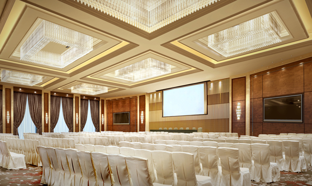 会议设施是现代宾馆的常备设施之一。现代大中型饭店一般都设有若干个不同规模的会议厅,以承接一定规模的会议及各种文化、商务活动。会议厅的位置宜独处饭店一隅,使会议人流路线与宾馆客流线分开,互不干扰,并避免会议厅噪声影响旅客休息。大小会议厅宜组成毗邻布置,但须注意隔声。一般会议厅的室内装修宜力求宁静清雅。厅内应有足够的光照和舒适的会议桌椅。对于高级会议厅,特别是国际会议厅,还须具备先进的声像设备,包括多声道的同声传译系统、摄录像和投影电视设备、幻灯机和书写投影仪、电影放映设备、音像系统、调光系统等。为了提高会议厅的利用率,多数饭店不专设大型会议厅,而改设多功能厅,使其既能满足大型会议要求,也能改作大型宴会厅、歌舞厅或展览场地。其厅内重点部位,特别是顶棚、地面、灯具等,宜予精心装修,以满足宴会、歌舞和展览之需要。
