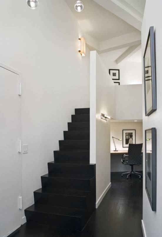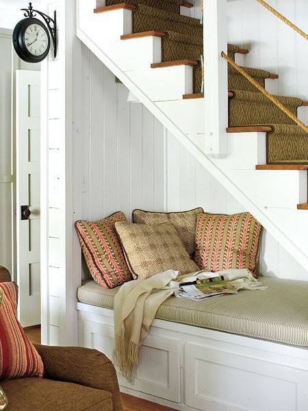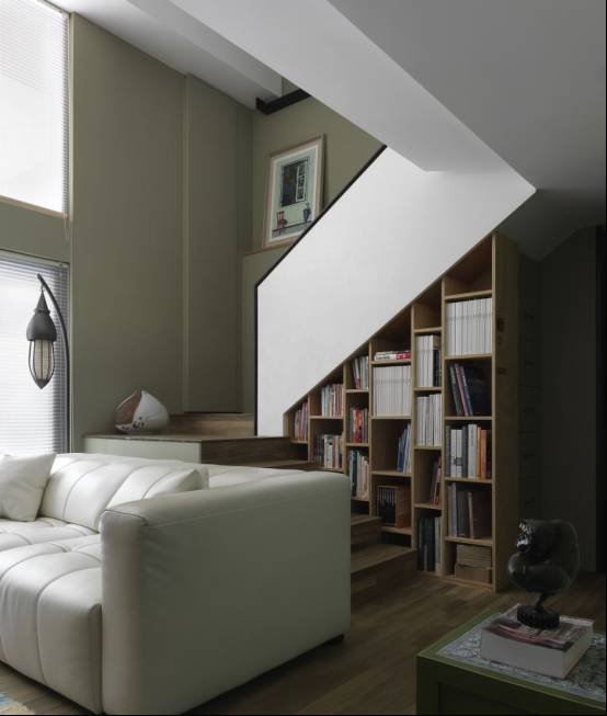 打造成独立的角落要考虑采光问题,因为楼梯下方本身自然采光薄弱,可利用灯光设计。再配上装饰画,调节空间气氛。转角式设计是最省空间的。