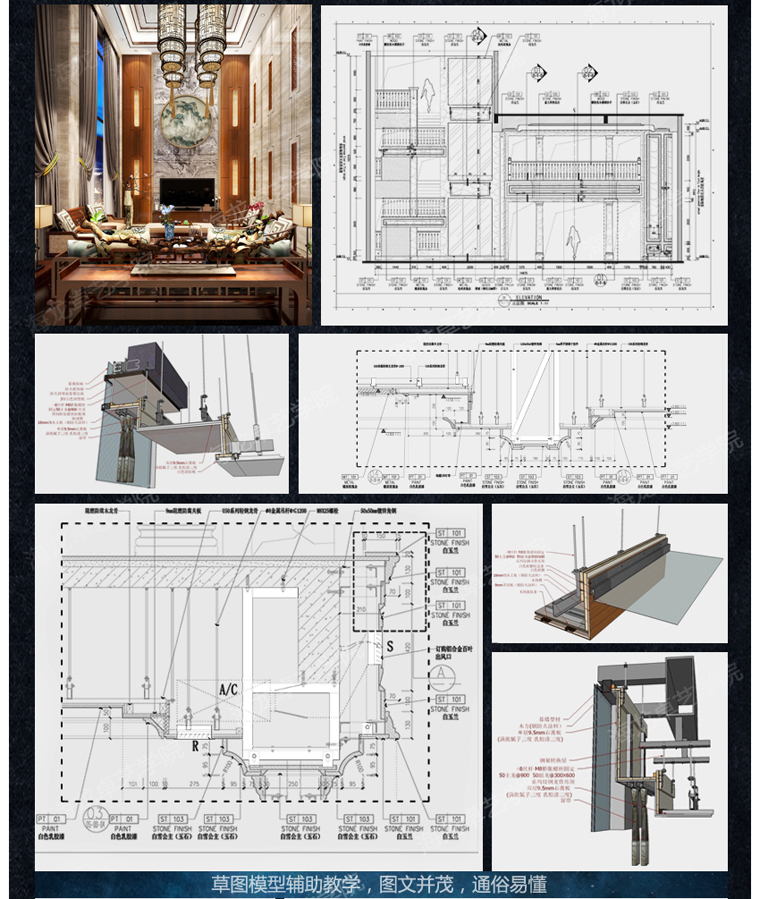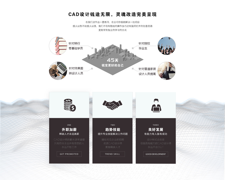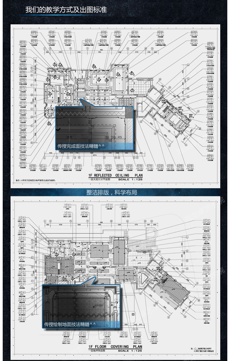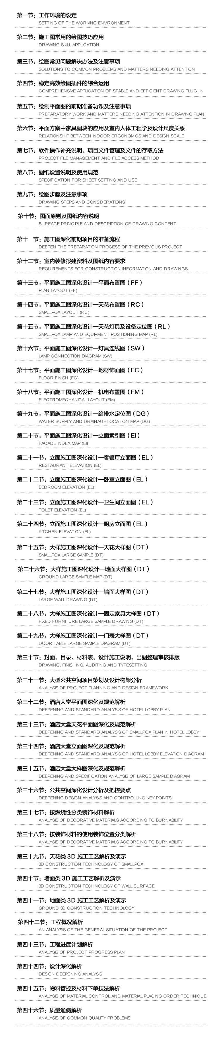 课程内容 :CAD常用加高级命令、CAD图层管理器、室内设计CAD制图技术(平面图、立面图、节点大样图等一整套制图方法)、布局空间、CAD出图规范、设计原理和施工图要点、施工图案例讲解、施工工艺、公装绘图实例