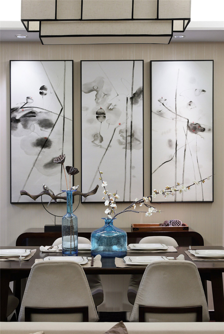 餐厅抢眼的水墨晕染花让空间瞬间高雅素净起来,原木色实木餐桌配上时尚的餐椅时尚禅意悠然而生。简洁的案几使空间更具层次。整洁的餐具配上蓝色的花