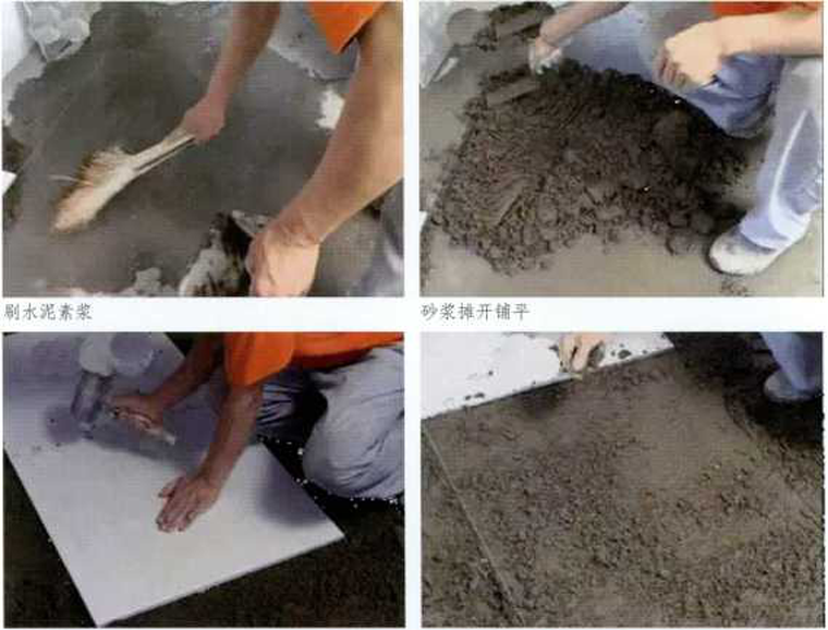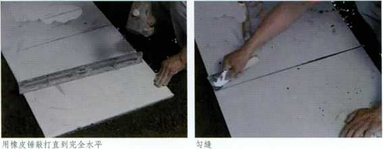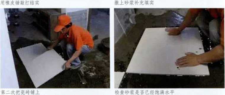 (2 )铺砖:为了找好位置和标高,应从门口开始,纵向先铺2~3行砖,以 此为标筋拉纵横水平标高线,铺贴时应从里向外退着操作,人不得踏在刚铺 好的砖上,每块砖应跟线。铺完2〜3行,应随时拉线检查缝格的平直度,如 超出规定应立即修整,将缝拨直,并用橡皮锤拍实。此项工作应在结合层凝 结之前完成。