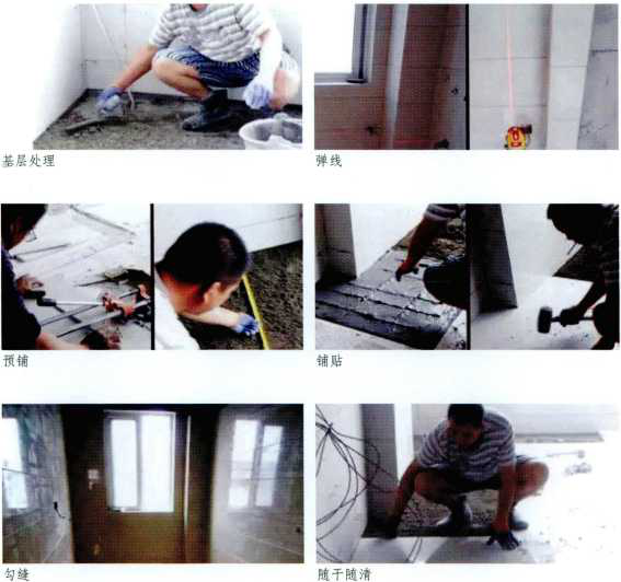预排一般从阳角开始,把非整块的砖排在次要部位,或墙阴角处,用废瓷砖 抹水泥混合砂浆作标志块,标志块间距l~l.6m ,用托线板、靠尺等挂直, 控制表面平整度。找平层上喷洒足够的水,将浸水的瓷片在水中取出,抹干 水渍,在砖背面均匀抹上1 : 3左右的水泥砂浆,砂浆厚度5~6mm为宜, 铺贴大规格瓷片适当加厚,随即将砖贴上,用木槌或胶锤轻轻拍牢平整,避 免空鼓,并随时用直尺或水平尺找平。铺贴时也可用水泥:108胶水:水 = 100 : 5 : 26的纯水泥增加结合黏度。